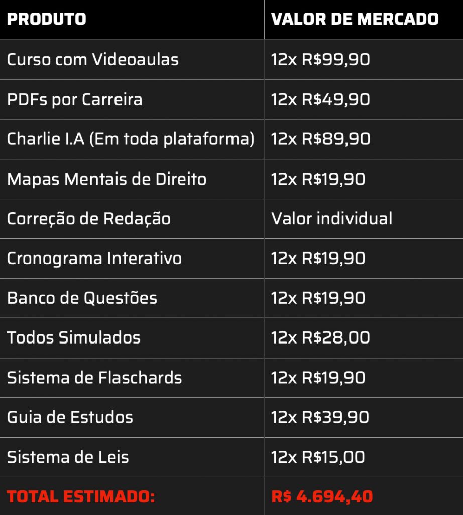 Videoaulas + Simulados + Questões + Resumos Interativos + Flashcards + Leis + Introdução aos assuntos + Guia de estudos com mentorias + Curso de redação Policial.